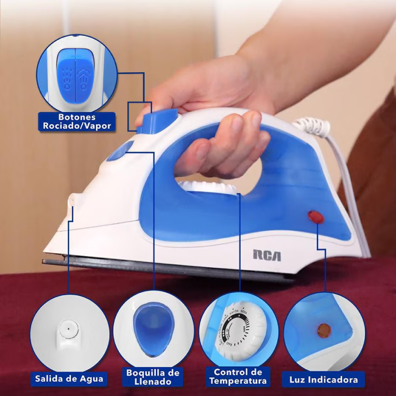 4. ROCIADOR DE AGUA: Suaviza arrugas rebeldes antes de pasar la plancha, facilitando el cuidado de las telas más difíciles.