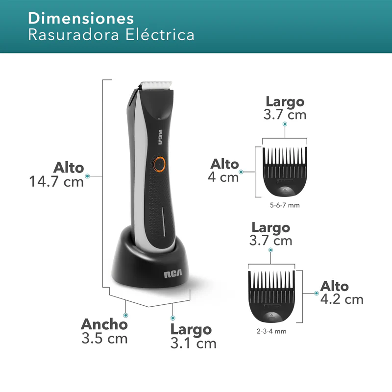 - Peines extraíbles: Podrás configurarlos cada uno en sus 3 medidas, formando un total de 6 tamaños diferentes para conseguir el largo del vello deseado.