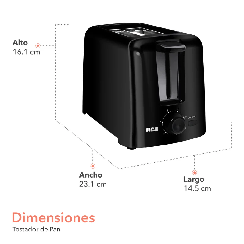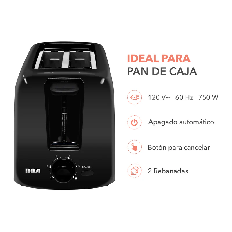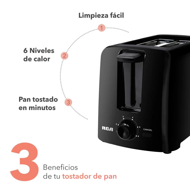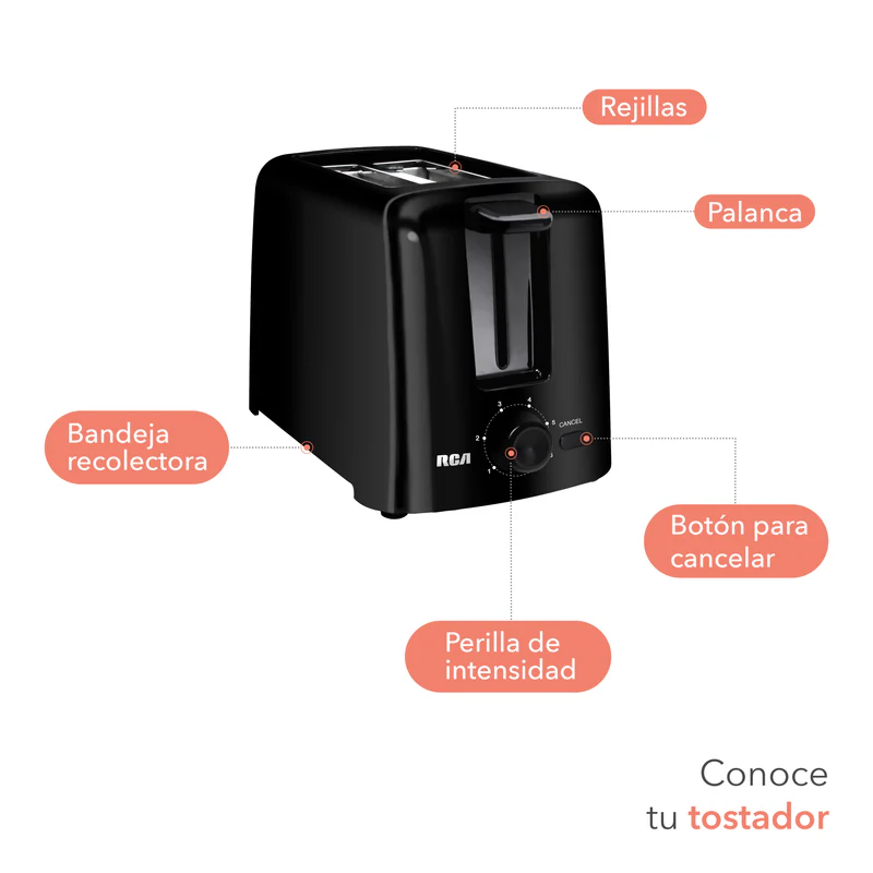 Con el Tostador de Pan RC-T2 disfruta de elegancia y eficiencia en tu hogar. Su diseño te permite calentar dos rebanadas al mismo tiempo. Cuenta con 6 niveles de intensidad para que poder elegir el nivel de tostado deseado, además de un botón de cancelación que detiene el proceso. Para hacer más práctica su limpieza cuenta con una bandeja recolectora de migajas.