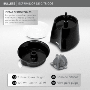 • Características del Producto: Incluye jarra medidora Acción de jugo de reversa automática 2 exprimidores para frutas grandes y pequeñas Piezas aptas para lavavajillas Tapa con filtro y varilla mezcladora