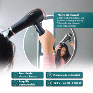 • Características del Producto: Voltaje: 127V. Su potencia es de 1600W. Con 2 velocidades. Voluminiza tu cabello.