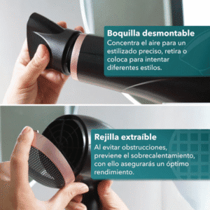 • Características del Producto: Cuenta con un cable de 1.3m de largo. Funciona con 3 niveles de temperatura. Con 3 velocidades. Es iónico. Contiene 1. Incluye gancho para colgar. Voluminizá tu cabello. Su potencia es de 1.2 kW.